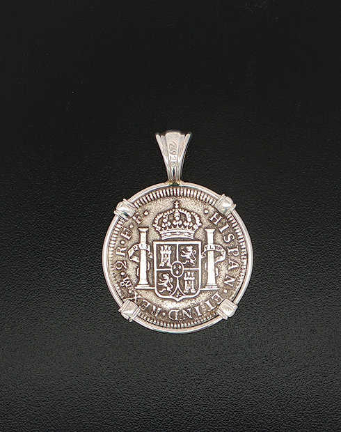 In 1784, the ill-fated ship, El Cazador, The Hunter was headed toward New Orleans from Vera Cruz, Mexico. The ship was laden with 450,000 pesos, which were intended to solidify Spain’s holdings of approximately one million square miles of America’s heartland, called the Louisiana Territory. The vessel and her crew disappeared without a trace, never arriving to help stabilize the economy. In 1803, Napoleon and President Thomas Jefferson struck a deal called the Louisiana Purchase. The U.S. purchased this land for three cents an acre. The U.S. doubled in size, taking on the familiar shape that defines it today. This may never have happened if not for the shipwreck that changed the world. This silver half real coin is hand-set in a sterling silver pendant.