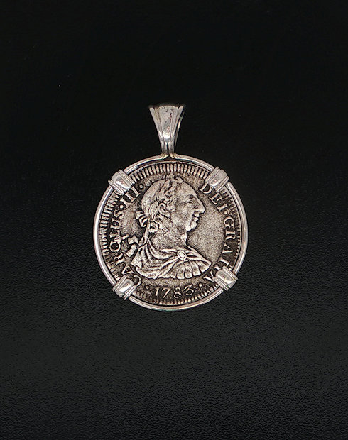 In 1784, the ill-fated ship, El Cazador, The Hunter was headed toward New Orleans from Vera Cruz, Mexico. The ship was laden with 450,000 pesos, which were intended to solidify Spain’s holdings of approximately one million square miles of America’s heartland, called the Louisiana Territory. The vessel and her crew disappeared without a trace, never arriving to help stabilize the economy. In 1803, Napoleon and President Thomas Jefferson struck a deal called the Louisiana Purchase. The U.S. purchased this land for three cents an acre. The U.S. doubled in size, taking on the familiar shape that defines it today. This may never have happened if not for the shipwreck that changed the world. This silver half real coin is hand-set in a sterling silver pendant.