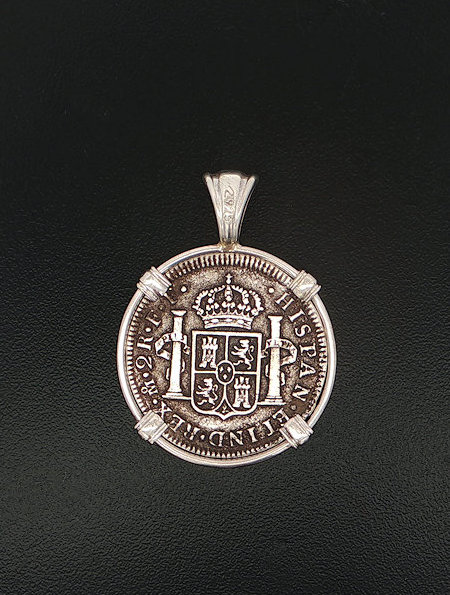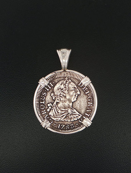 In 1784, the ill-fated ship, El Cazador, The Hunter was headed toward New Orleans from Vera Cruz, Mexico. The ship was laden with 450,000 pesos, which were intended to solidify Spain’s holdings of approximately one million square miles of America’s heartland, called the Louisiana Territory. The vessel and her crew disappeared without a trace, never arriving to help stabilize the economy. In 1803, Napoleon and President Thomas Jefferson struck a deal called the Louisiana Purchase. The U.S. purchased this land for three cents an acre. The U.S. doubled in size, taking on the familiar shape that defines it today. This may never have happened if not for the shipwreck that changed the world. This silver half real coin is hand-set in a sterling silver pendant.