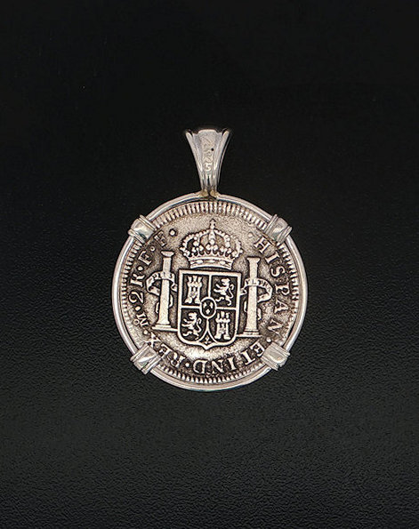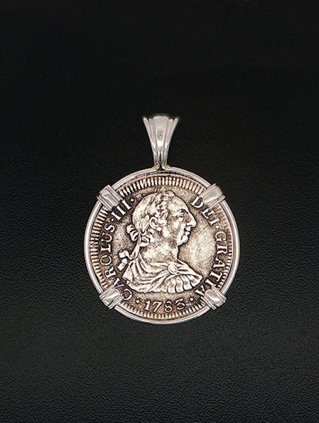 In 1784, the ill-fated ship, El Cazador, The Hunter was headed toward New Orleans from Vera Cruz, Mexico. The ship was laden with 450,000 pesos, which were intended to solidify Spain’s holdings of approximately one million square miles of America’s heartland, called the Louisiana Territory. The vessel and her crew disappeared without a trace, never arriving to help stabilize the economy. In 1803, Napoleon and President Thomas Jefferson struck a deal called the Louisiana Purchase. The U.S. purchased this land for three cents an acre. The U.S. doubled in size, taking on the familiar shape that defines it today. This may never have happened if not for the shipwreck that changed the world. This silver half real coin is hand-set in a sterling silver pendant.