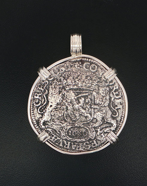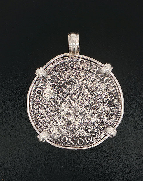 This silver Ducatoon was minted in 1759 in Capen, The Netherlands. This Coin features ships sailing the with legend around crowned arms, a rampant lion with half of it in the sea. Between the dates of 1600-1795 these silver coins were known as a “Ship Shilling” by the sailors of the day, as they are the same size and about the same value as the British shilling of the day. This coin was hand-set in a 14kt gold pendant. This coin was found from the Akerendem Shipwreck 1676.