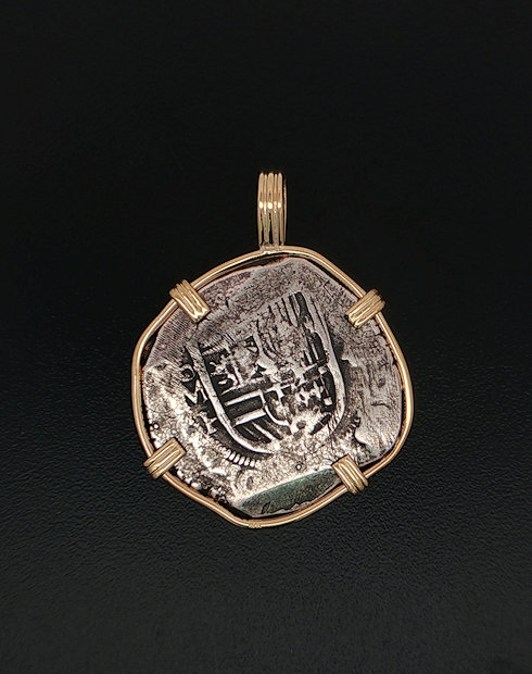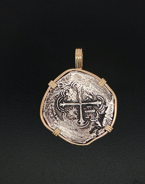 This Spanish cob four real silver coin was minted in Mexico City, Mexico dated 1598 – 1622. The ruler of this coin being Phillip III. This Spanish cob features the Mexico City cross with the shield on the back. This coin is from the Lucayan shipwreck and is handset in a 14kt gold pendant.