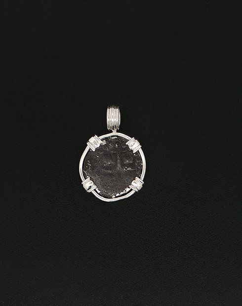 This Spanish Cob One Half Real was minted in Lima, Peru dated Circa 1700 – 1724. This ruler of this coin being Philip V, this coin features the cross of Jerusalem and the Bourbon shield crowned. This coin was found in the Shipwreck Louisa and is handset in a sterling silver pendant.