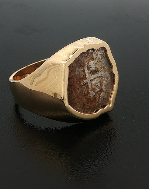 This one half real Spanish cob features the Spanish cross and the Monogram of the ruler Carlos II, This coin is minted in Mexico City, Mexico. This one Real coin is from the 1715 Fleet Shipwreck, This coin is set in 14kt good framed ring, Size 10.5