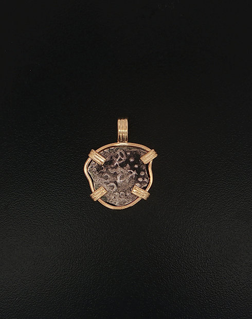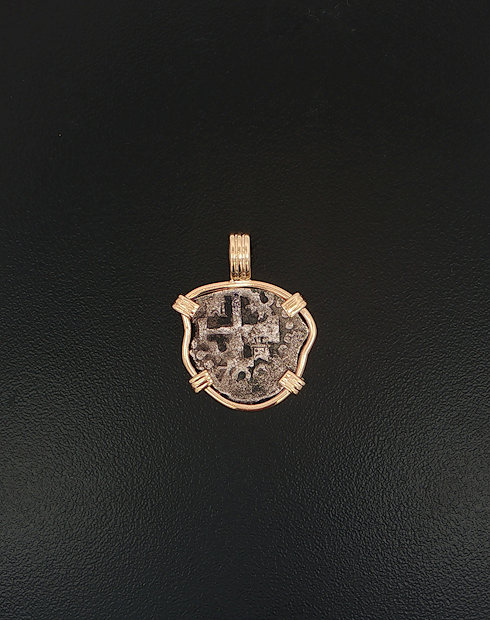 This Spanish Cob One Real was minted in Lima, Peru dated Circa 1700 – 1724. This ruler of this coin being Philip V, this coin features the cross of Jerusalem and the Bourbon shield crowned. This coin was found in the Shipwreck Feversham and is handset in a 14kt gold pendant.