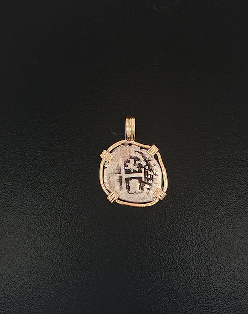 This Spanish Cob One Real was minted in Lima, Peru dated Circa 1700 – 1724. This ruler of this coin being Philip V, this coin features the cross of Jerusalem and the Bourbon shield crowned. This coin was found in the Shipwreck Feversham and is handset in a 14kt gold pendant.