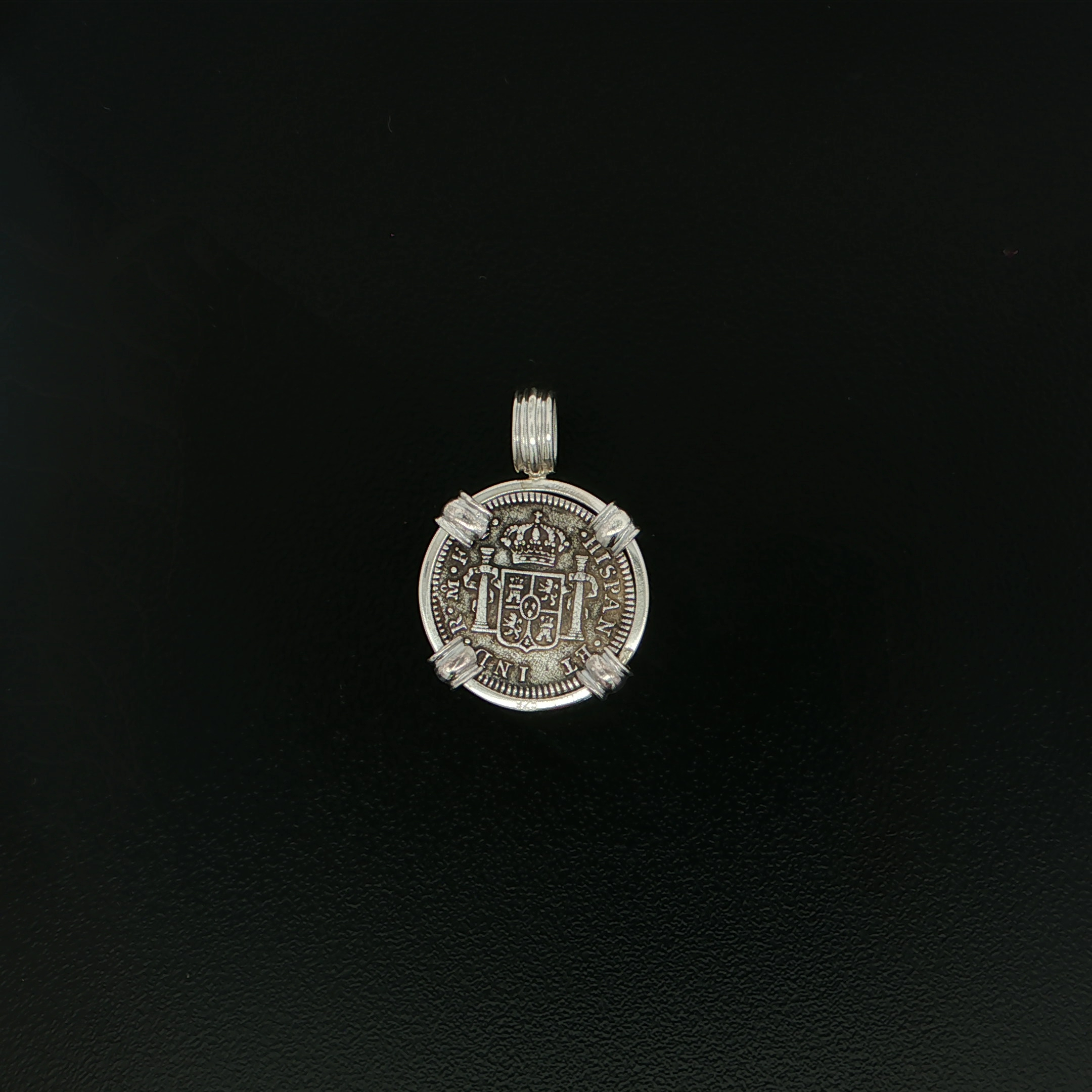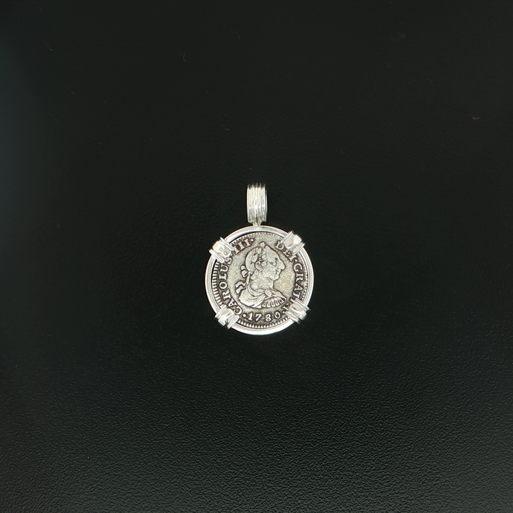 This Silver Half Real Spanish Bust coin was minted in 1780, In Mexico, Mexico City. The ruler being Fernando VII, this coin features the bourbon coat of arms with the bust of Carlos III. This Spanish Bust is hand set in a sterling silver pendant.