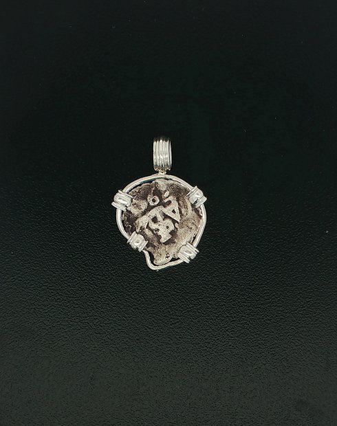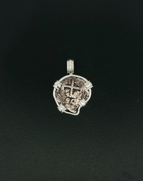 This silver half real cob was minted in Potosi, Bolivia. Dated in 1690. The ruler being Philip V. This half real cob features a sterling silver bail attached. The view of this coin has the monogram of Philip V and the cross of Jerusalem.