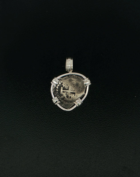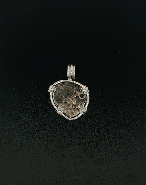 This Spanish coin was minted in Potosi, Bolivia. The ruler was Carlos III. This coin is a silver One Half Real Spanish coin, featuring the Monogram of the ruler along with the Cross of Jerusalem. It is handset in a sterling silver pendant.