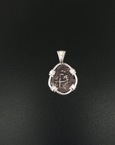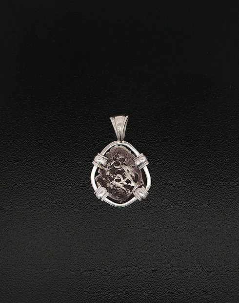 This silver One Half Real cob was minted in Potosi, Bolivia. Dated in 1700 – 1746. The ruler being Philip V. This half real cob is hand set in a sterling silver pendant. The view of this coin has the Monogram of the ruler with cross of Jerusalem.