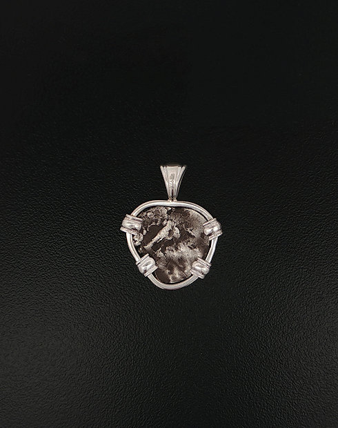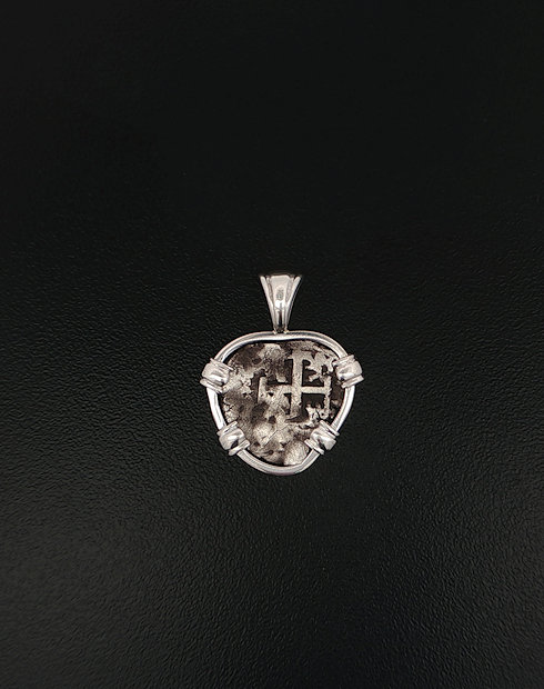 This silver half real cob was minted in Potosi, Bolivia. Dated in 1700 – 1746. The ruler being Philip V. This half real cob is hand set in a sterling silver pendant. The view of this coin has the monogram of Philip V and the cross of Jerusalem.