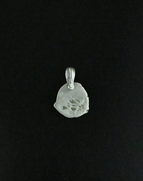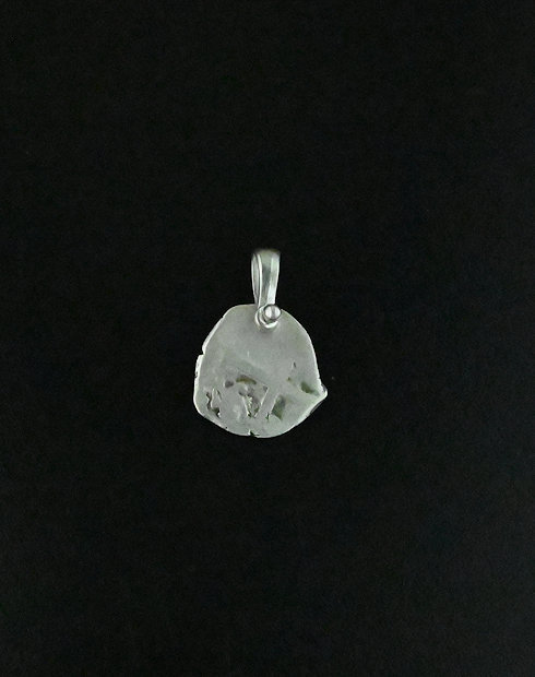This Spanish coin was minted in Potosi, Peru. The ruler was Carlos III. This coin is a silver One Real Spanish coin, featuring the Monogram of the ruler along with the Cross of Jerusalem. It is handset in a sterling silver bail.