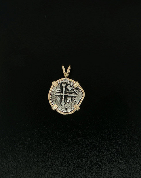 This Spanish cross was minted in Mexico City, Mexico. Dated in 1627, The ruler being Philip IV. This Spanish Cross One Half Real coin is hand set in a 14kt gold pendant. The view of this Coin has the Monogram of the ruler and the cross of Mexico City.