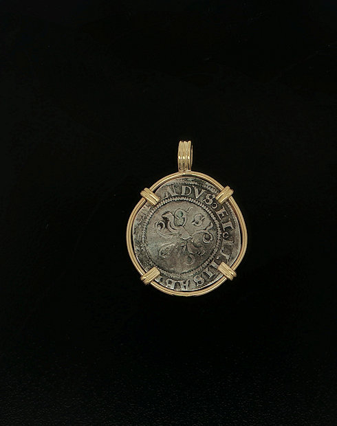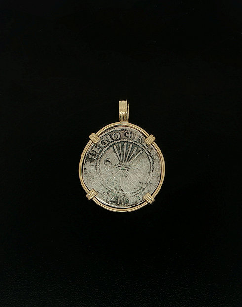 This one half real Spanish cob features arrows and bows with the ornate design. This coin is minted in Spain, Segovia. This one Real coin is from the 1474-1504 Ferdinand & Isabella This coin is set in a 14kt Gold pendant.