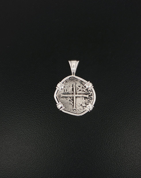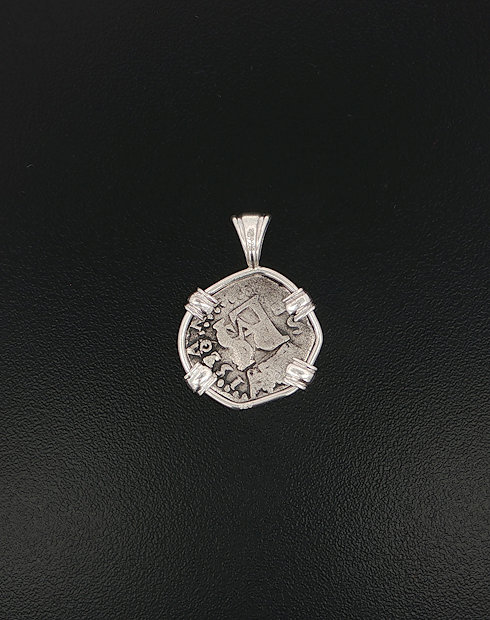 This Spanish coin was minted in Seville, Spain. The ruler was Phillip II. This coin is a silver One Half Real Spanish coin, featuring the Crowned shield of the Castle. It is handset in a sterling silver pendant.