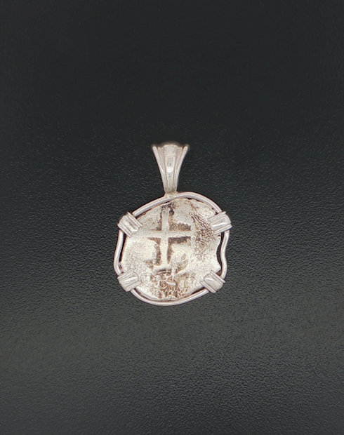 This Spanish Cob One Real was minted in Potosi, Bolivia dated Circa 1709. This ruler of this coin being Philip V, this coin features the cross of Jerusalem and the Pillars and waves design. This coin is handset in a sterling silver pendant.