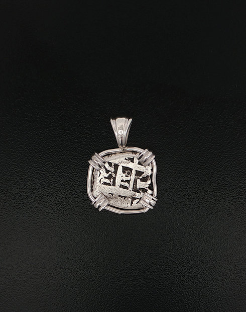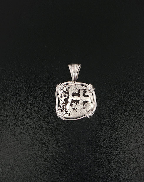 This silver One Real cob was minted in Potosi, Bolivia. Dated in 1746 – 1759. The ruler being Ferdinand VI. This half real cob is hand set in a sterling silver pendant. The view of this coin has the pillars and waves design with cross of Jerusalem.