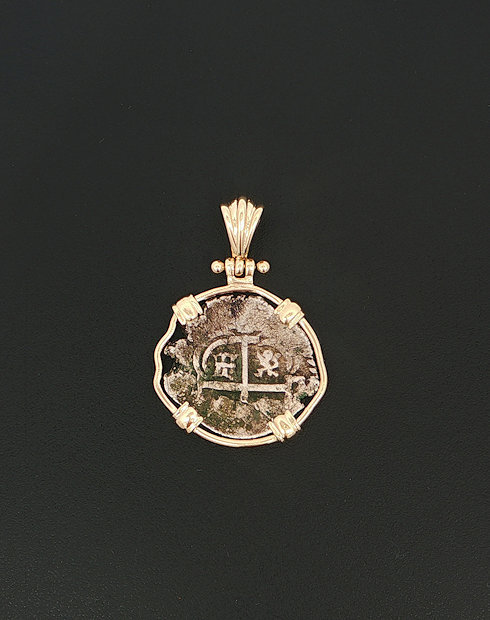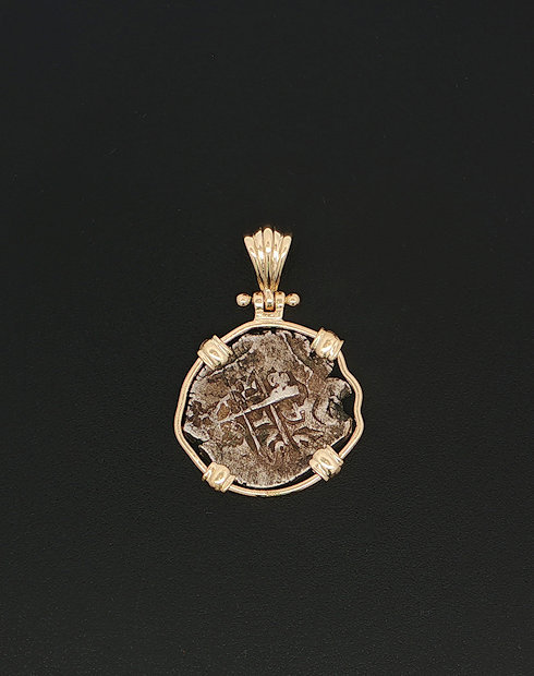 This Spanish Cob One Real was minted in Potosi, Bolivia dated Circa 1700 – 1746. This ruler of this coin being Philip V, this coin features the cross of Jerusalem and the Pillars and waves design. This coin is handset in a 14kt gold Pendant.