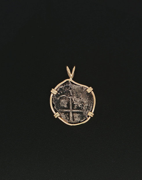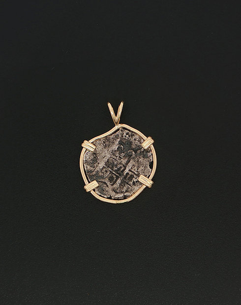 This Spanish Cob One Real was minted in Potosi, Bolivia dated Circa 1665 – 1700. This ruler of this coin being Charles II, this coin features the cross of Jerusalem and the Pillars and waves design. This coin is handset in a 14kt gold pendant.