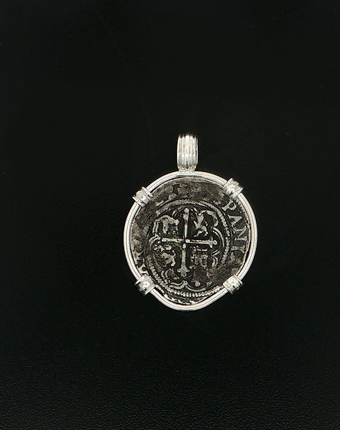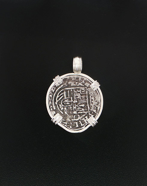 This Spanish Cob was minted in Mexico City, Mexico. Dated in 1556-1598 making the ruler for this coin Philip II, this two Real Spanish cob features the shield design with the minted year. This coin is set in a sterling silver pendant.