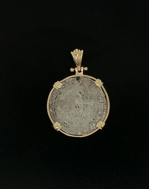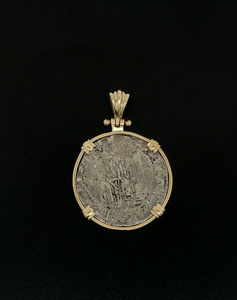 This one half real Spanish cob features arrows and bows with the ornate design. This coin is minted in Spain, Segovia. This one Real coin is from the 1474-1504 Ferdinand & Isabella This coin is set in a 14kt Gold pendant.