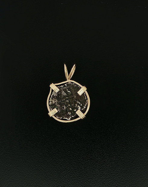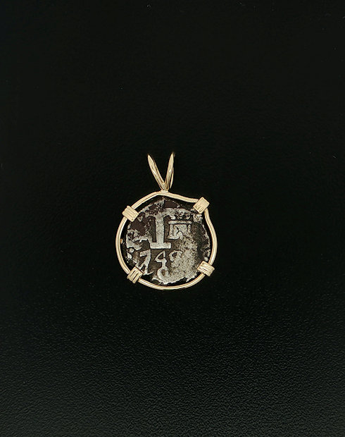 This Spanish Cob was minted in Potosi, Peru. Dated in 1759 making the ruler for this coin Ferdinand VI, this two Real Spanish cob features the shield design with the minted year. This coin is set in a 14kt gold pendant.