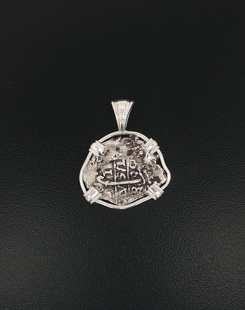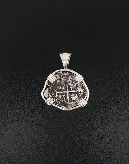 This silver One Real cob was minted in Potosi, Bolivia. Dated in 1759 – 1788. The ruler being Carlos III This half real cob is hand set in a sterling silver pendant. The view of this coin has the pillars and waves design with cross of Jerusalem.