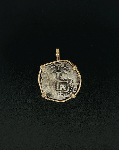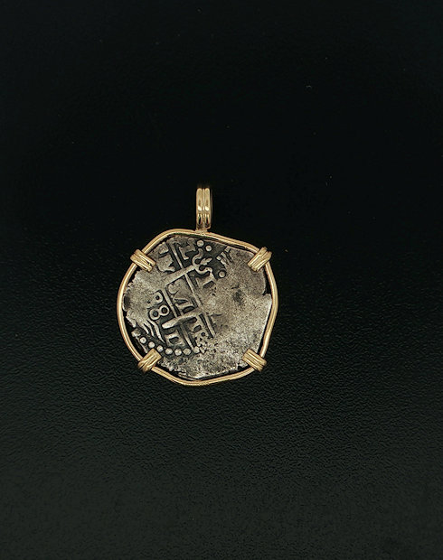 This one real Spanish cob features the cross of Jersuleam and the pillars and waves design. This coin is minted in Lima, Peru.  This one Real coins ruler was Carlos II, This coin is set in a 14kt Gold pendant.