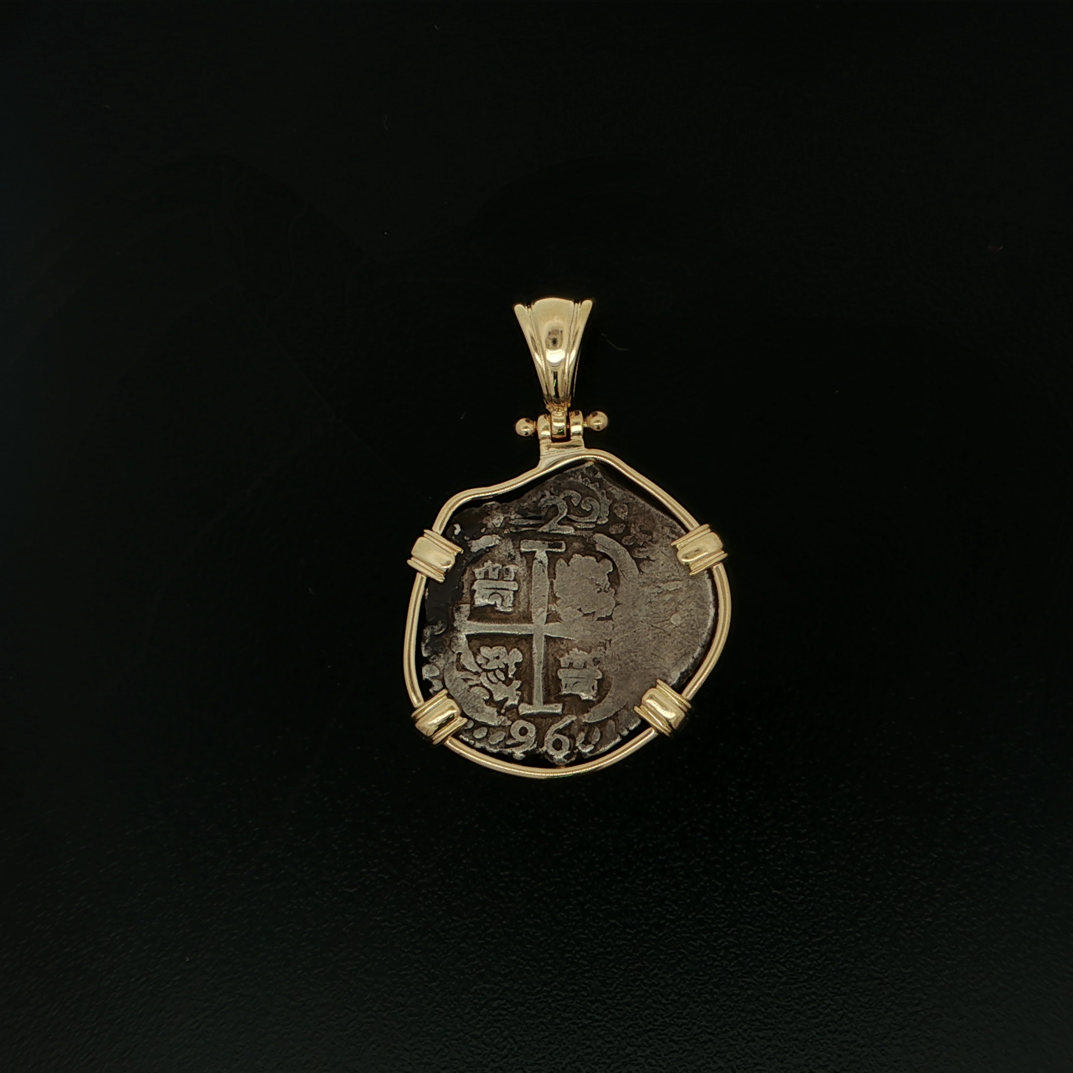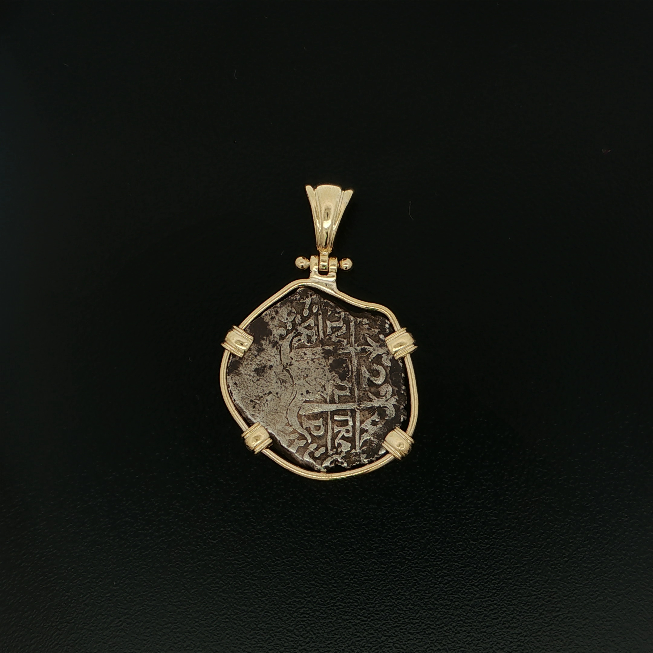 This Spanish Cob Half Real was minted in Mexico, Mexico City. Dated between 1665-1700, The ruler being Carlos II. This Cob Features the Pillars and Waves with the cross of Jerusalem with Lions and Castles. This coin is handset in a 14kt gold pendant.