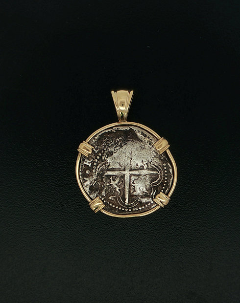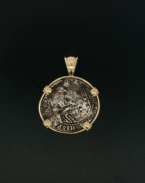 This Spanish Cob was minted in Potosi, Bolivia. Dated in 1556-1598 making the ruler for this coin Philip II, this two Real Spanish cob features the shield design with the minted year. This coin is set in a 14kt gold pendant.