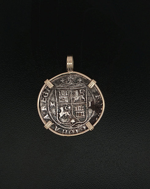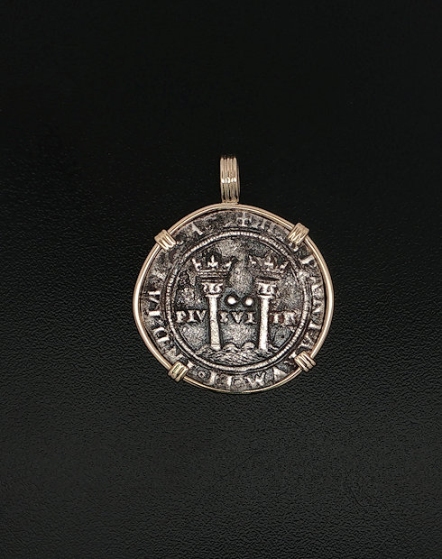 This Two Real Spanish Cob was minted in Mexico, Mexico city dated Circa 1536 – 1571. The ruler of this silver One Real being Carlos and Johanna, this coin features the crowned bourbon coat of arms and the pillars of Herkales with the denomination along with the date surrounding. This coin is hand-set in a 14kt gold pendant.