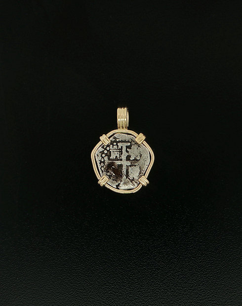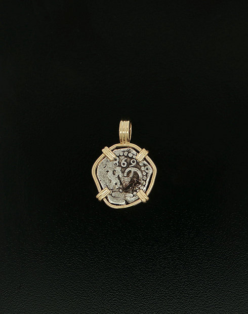 This Spanish coin was minted in Lima, Peru. The ruler was Carlos II. This coin is a silver One half Real Spanish coin, featuring the Monogram of the ruler along with the Cross of Jerusalem. It is handset in a 14kt gold pendant.