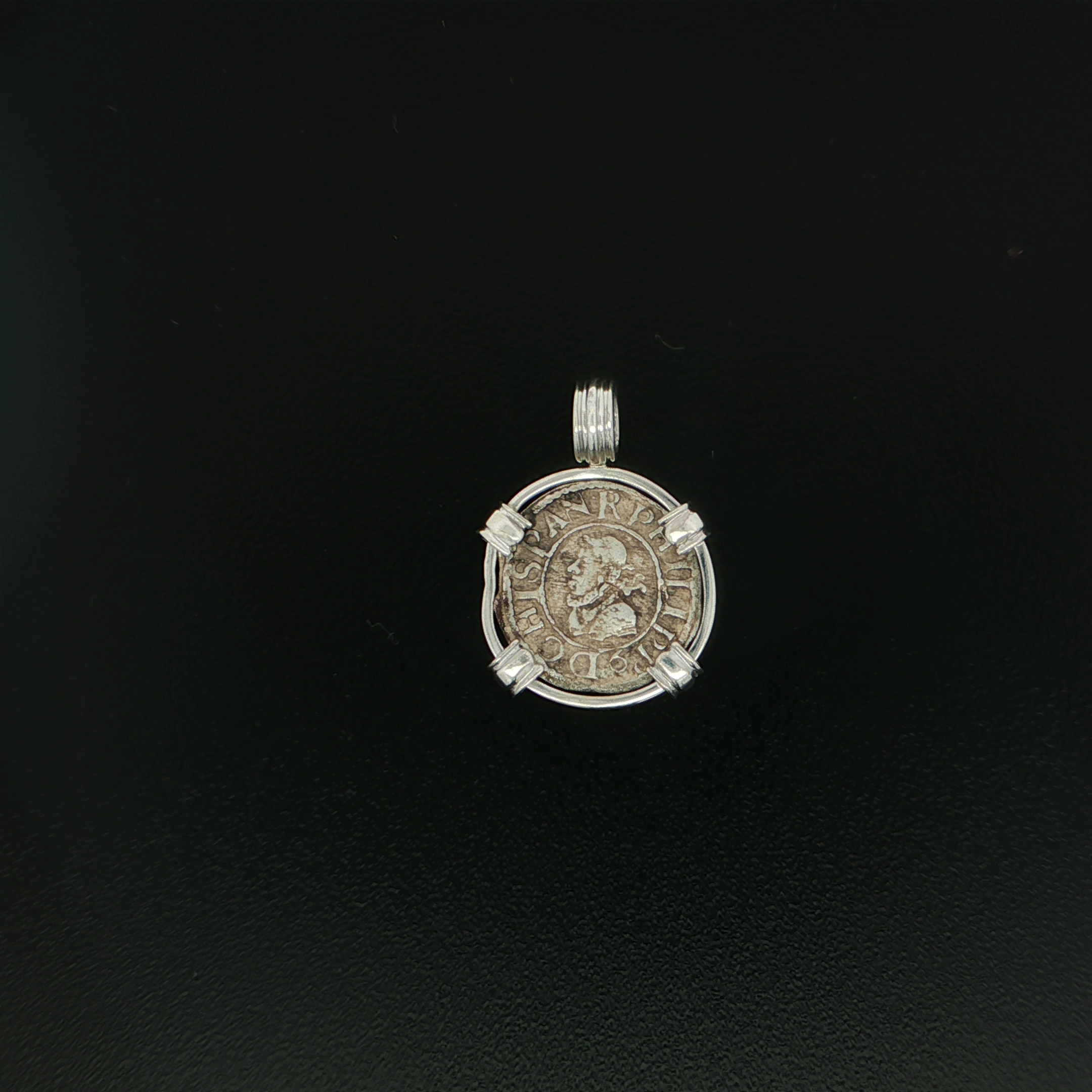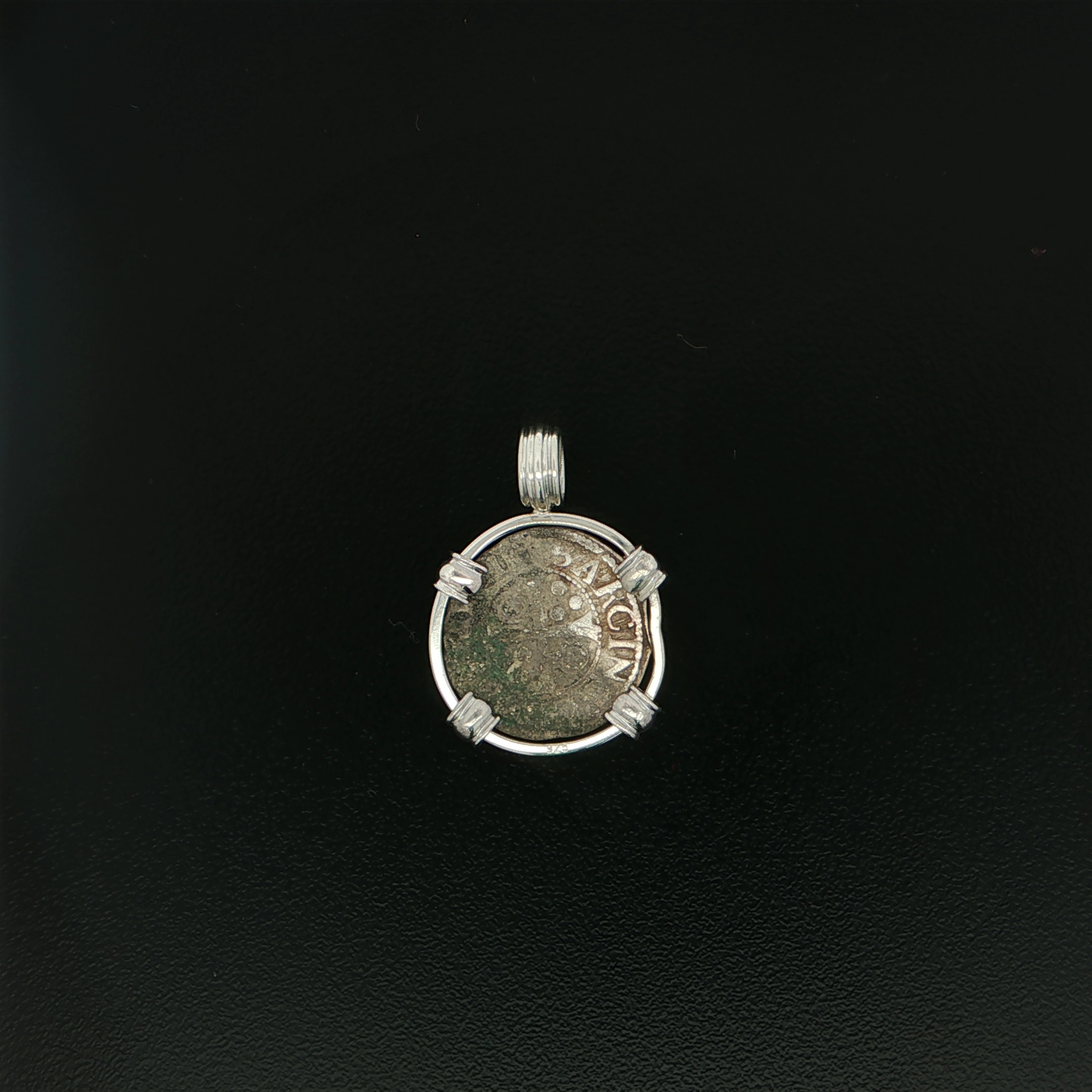 When Carlos II of Spain died without an heir in 1700, he named Philip V, grandson of Louis XIV, as his successor, sparking the War of Spanish Succession. Philip eventually secured the throne, becoming the first Bourbon king of Spain. His rival, Charles VI (then known as Carlos III, the Pretender), held power only in Catalonia before inheriting the Austrian crown in 1711. With his elevation, allies withdrew support, leading to the Treaty of Utrecht, which confirmed Philip V as king. Charles later issued the Pragmatic Sanction to ensure his daughter Maria Theresa’s succession, though she faced wars to claim her inheritance. This coin was handset in a sterling silver pendant.