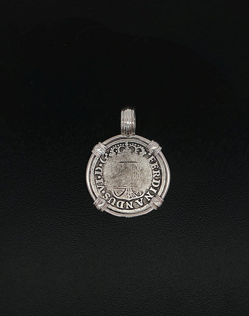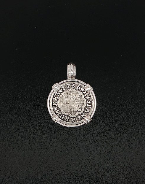 This Spanish cross was minted in Madrid, Spain, Dated Circa 1746 – 1759. The ruler being Ferdinand VI, This Spanish Cross One Real coin is hand set in a sterling silver pendant. The view of this Coin has the Bourbon Crowned Arms with Lions and Castles Quartered in Cross.