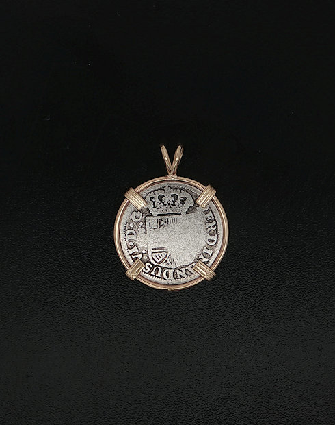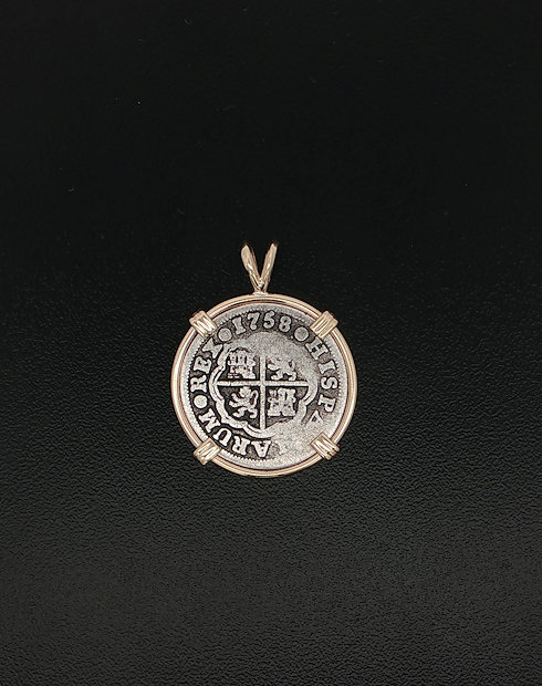 This Spanish cross was minted in Madrid, Spain, Dated Circa 1746 – 1759. The ruler being Ferdinand VI,  This Spanish Cross One Real coin is hand set in a 14kt gold pendant. The view of this Coin has the Bourbon Crowned Arms with Lions and Castles Quartered in Cross.