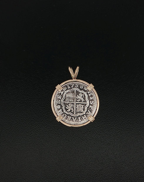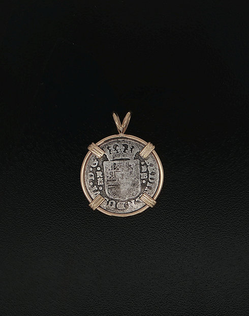 This Spanish cross was minted in Madrid, Spain, Dated Circa 1746 – 1759. The ruler being Ferdinand VI, This Spanish Cross One Real coin is hand set in a 14kt gold pendant. The view of this Coin has the Bourbon Crowned Arms with Lions and Castles Quartered in Cross.