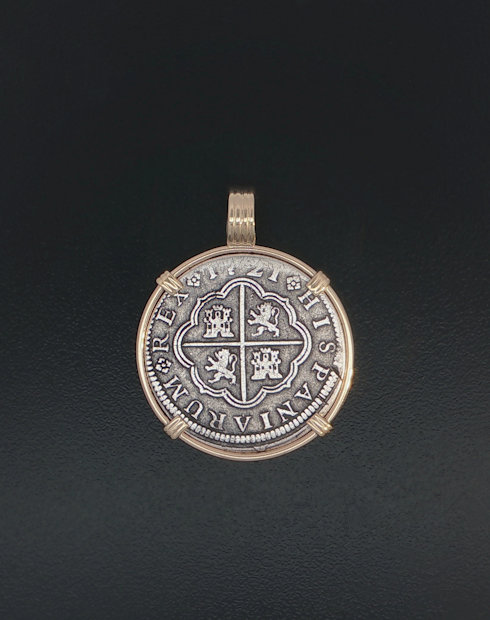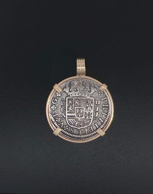 This Spanish cross was minted in Segovia Spain, Dated in 1721. Philip V. This Spanish Cross Two Real coin is hand set in a 14kt gold pendant. The view of this Coin has the Bourbon Crowned Arms with Lions and Castles Quartered in Cross.