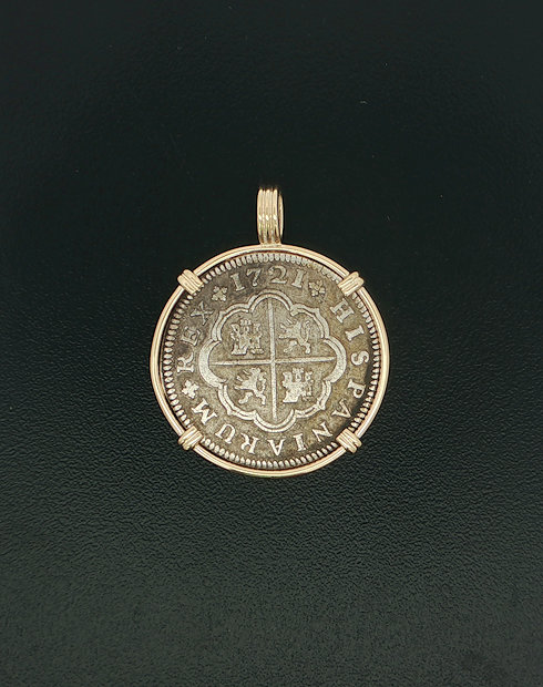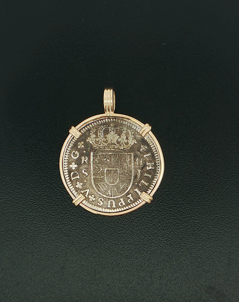 This Spanish cross was minted in Segovia Spain, Dated in 1700-1746. Philip V. This Spanish Cross Two Real coin is hand set in a 14kt gold pendant. The view of this Coin has the Bourbon Crowned Arms with Lions and Castles Quartered in Cross.
