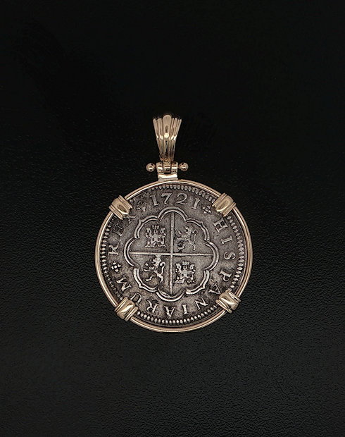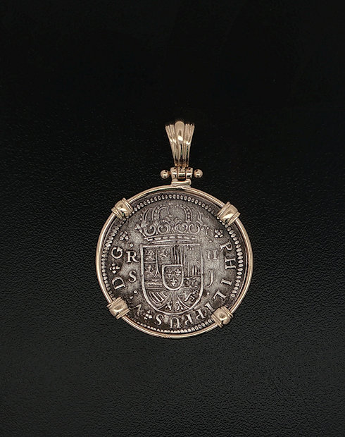 This Spanish cross was minted in Seville, Spain, Dated in 1700-1746. The ruler being Philip V. This Spanish Cross Two Real coin is hand set in a 14kt gold pendant. The view of this Coin has the Bourbon Crowned Arms with Lions and Castles Quartered in Cross.
