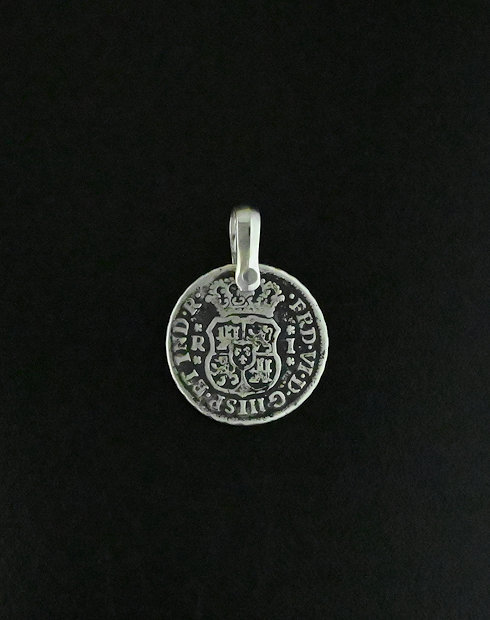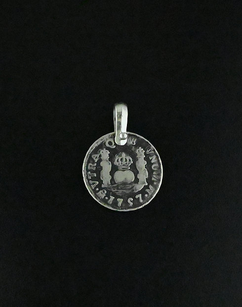 This One Real Spanish Pillar was minted in Mexico, Mexico city dated in 1767. The ruler of this silver One Real being Ferdinand VI, this coin features the crowned bourbon coat of arms and the pillars of Herkales with the denomination along with the date surrounding. This coin has a handset sterling bail attached.