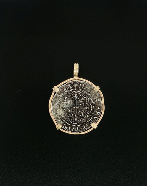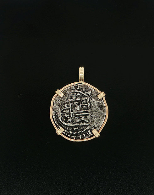This One Real Spanish Pillar was minted in Mexico, Mexico city dated in 1556-1598 The ruler of this silver One Real being Phillip II, this coin features the crowned bourbon coat of arms and the pillars of Herkales with the denomination along with the date surrounding. This coin is hand-set in a 14kt gold pendant.