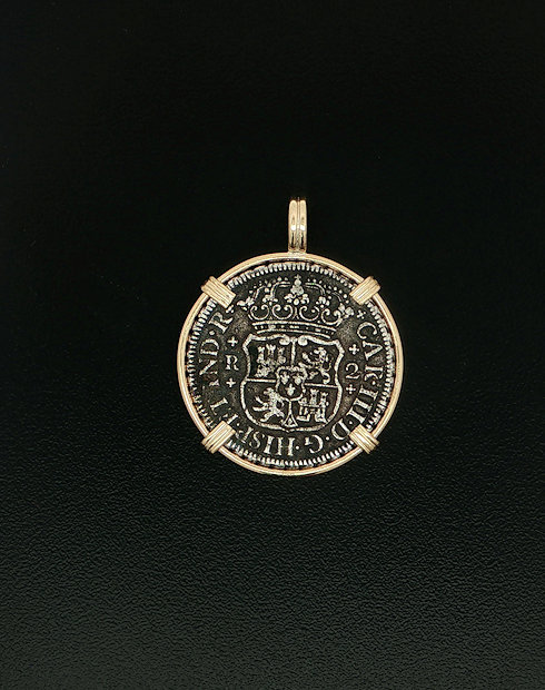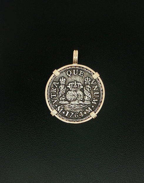 This Two Real Spanish Pillar was minted in Mexico, Mexico city dated in 1754. The ruler of this silver One Real being Fernando VI, this coin features the crowned bourbon coat of arms and the pillars of Herkales with the denomination along with the date surrounding. This coin is  hand-set in a 14kt gold pendant.