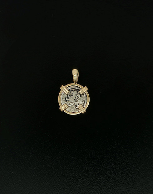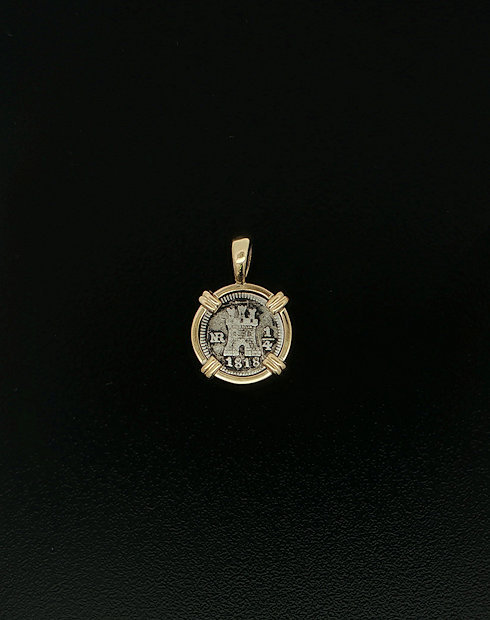 This Silver Spanish Quartilla One Real was minted in 1816 Nuevo Reino, Colombia. The ruler for this coin was Ferdinand VII, This coin features the rampant lion with castles and date around. This One Quarter Real is handset in a 14kt gold pendant.