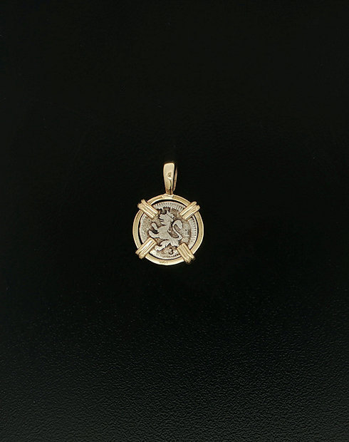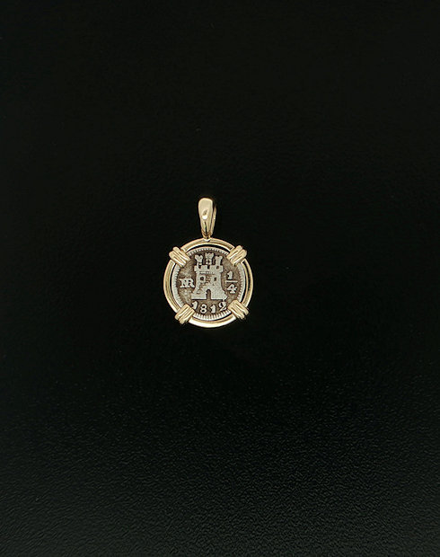 This Silver Spanish Quartilla One Real was minted in 1816 Nuevo Reino, Colombia. The ruler for this coin was Ferdinand VII, This coin features the rampant lion with castles and date around. This One Quarter Real is handset in a 14kt gold pendant.