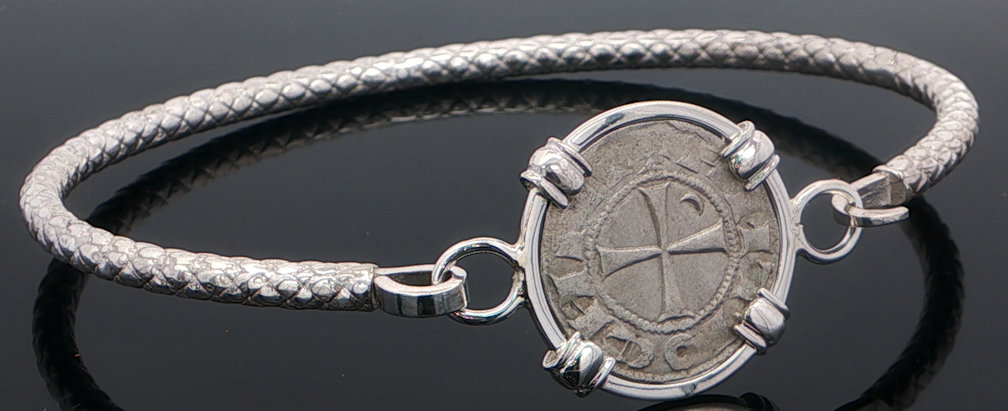 This coin was minted in Antioch which became the base for the Apostle Paul’s missionary journeys, where Jesus’ followers were first called Christians (Acts 11:26) and where the Gospel of Matthew was probably written. The city and its massive walls also played an important role during the Crusades. Featured on the reverse of the silver denier is a cross (the cross of Jerusalem, the Crusader’s cross or the Maltese cross). The Maltese cross is a symbol of the Christian warrior, of protection, a badge of honor. The eight points on the Maltese cross symbolize the chivalric virtues: Loyalty; Piety; Frankness; Braveness; Glory and Honor; Contempt of Death; Helpfulness towards the Poor and the Sick; and Respect for the Church. Firefighters use the symbol today as their badge of honor and bravery. This coin was minted under the rule of Bohemond III, portrait on obverse around 1163 to 1201 and hand-framed in a sterling silver pendant.