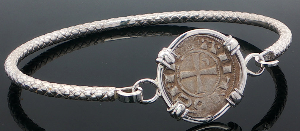 This coin was minted in Antioch which became the base for the Apostle Paul’s missionary journeys, where Jesus’ followers were first called Christians (Acts 11:26) and where the Gospel of Matthew was probably written. The city and its massive walls also played an important role during the Crusades. Featured on the reverse of the silver denier is a cross (the cross of Jerusalem, the Crusader’s cross or the Maltese cross). The Maltese cross is a symbol of the Christian warrior, of protection, a badge of honor. The eight points on the Maltese cross symbolize the chivalric virtues: Loyalty; Piety; Frankness; Braveness; Glory and Honor; Contempt of Death; Helpfulness towards the Poor and the Sick; and Respect for the Church. Firefighters use the symbol today as their badge of honor and bravery. This coin was minted under the rule of Bohemond III, portrait on obverse around 1163 to 1201 and hand-framed in a sterling silver pendant with a sterling silver bracelet attached
