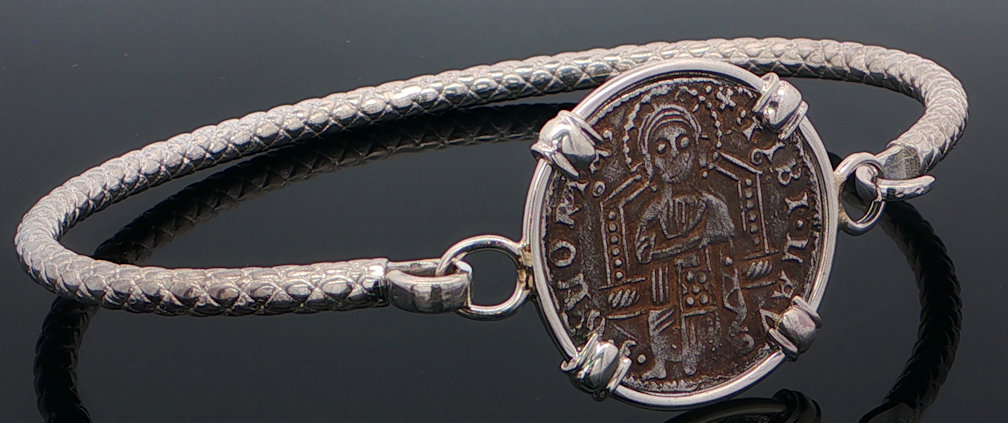This silver Grosso features Christ enthroned and the reverse ST Mark and Doge standing. This artifact was dated between 1383-1534. This coin is handset in a sterling silver frame with a sterling silver bracelet attached.