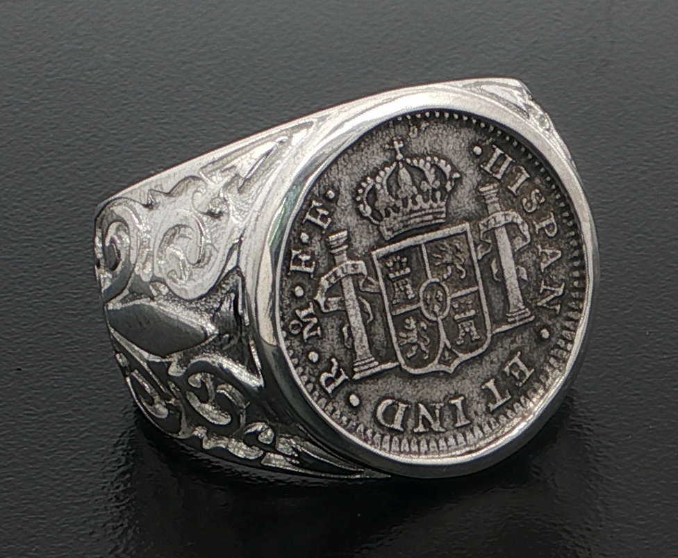 In 1783, the ill-fated ship, El Cazador, The Hunter was headed toward New Orleans from Vera Cruz, Mexico. The ship was laden with 450,000 pesos, which were intended to solidify Spain’s holdings of approximately one million square miles of America’s heartland, called the Louisiana Territory. The vessel and her crew disappeared without a trace, never arriving to help stabilize the economy. In 1803, Napoleon and President Thomas Jefferson struck a deal called the Louisiana Purchase. The U.S. purchased this land for three cents an acre. The U.S. doubled in size, taking on the familiar shape that defines it today. This may never have happened if not for the shipwreck that changed the world.  This silver one real coin is hand-set in a sterling silver frame size 11.