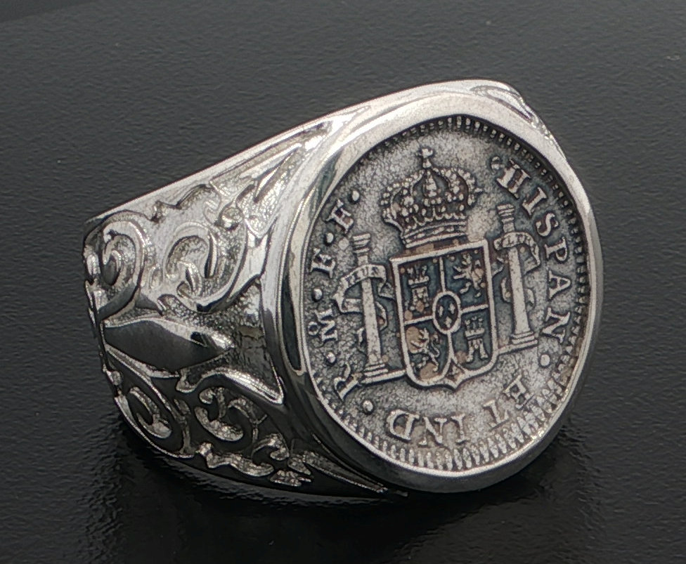 In 1783, the ill-fated ship, El Cazador, The Hunter was headed toward New Orleans from Vera Cruz, Mexico. The ship was laden with 450,000 pesos, which were intended to solidify Spain’s holdings of approximately one million square miles of America’s heartland, called the Louisiana Territory. The vessel and her crew disappeared without a trace, never arriving to help stabilize the economy. In 1803, Napoleon and President Thomas Jefferson struck a deal called the Louisiana Purchase. The U.S. purchased this land for three cents an acre. The U.S. doubled in size, taking on the familiar shape that defines it today. This may never have happened if not for the shipwreck that changed the world. This silver one real coin is hand-set in a sterling silver frame size 11.